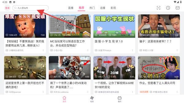 1、进入主页面:打开哔哩哔哩APP,点击底部导航栏最左侧的推荐图标,进入主页面顶部中间可见搜索栏。