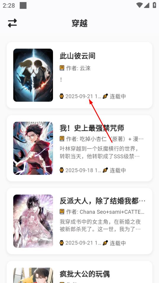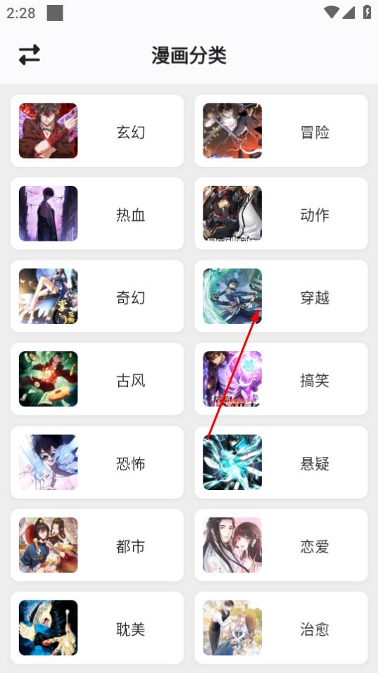 2、在漫画分类页面,点击穿越分类,查看穿越类漫画。