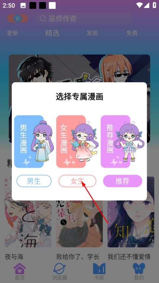 2、在选择专属漫画弹窗中,点击女生,进入女生漫画推荐页面。