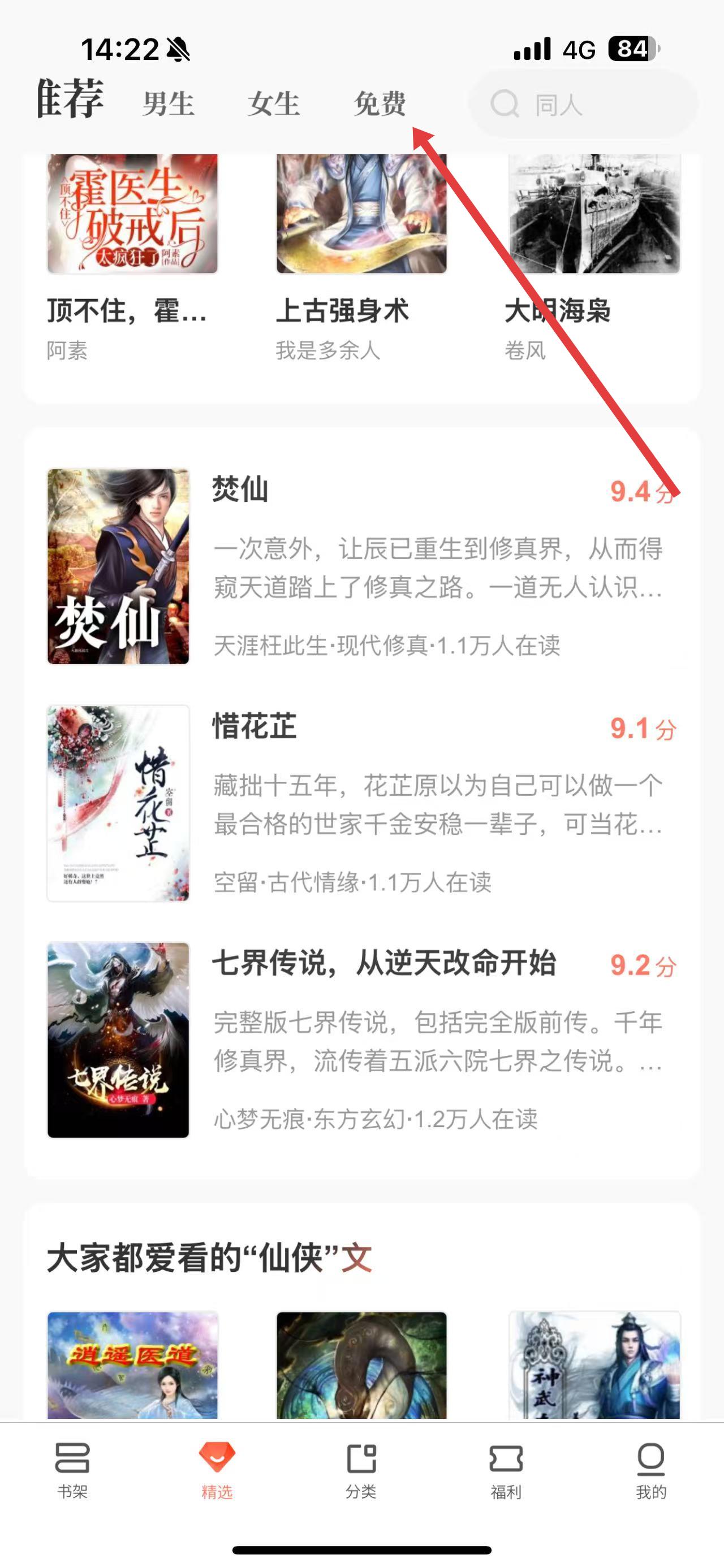 1、打开文渊阁小说App,在首页上方导航栏中,点击免费选项,进入免费小说的资源列表页面。