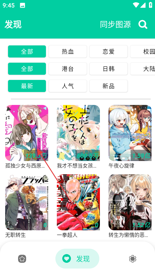 1、在漫画类应用中,点击底部发现图标,进入发现页面。