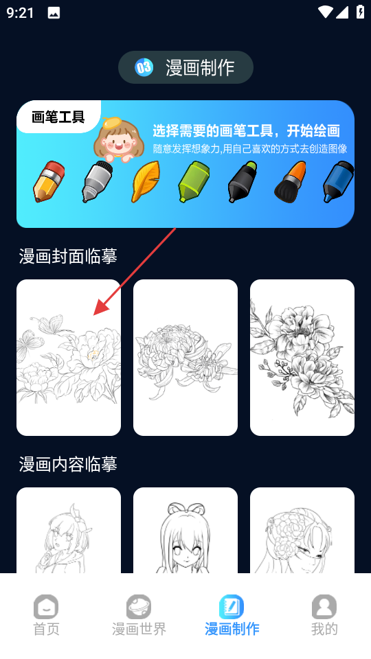 2、进入漫画制作页面后,选择漫画封面临摹中的图案。