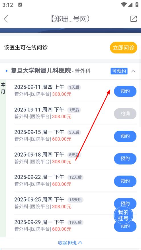 4、在专家详情页面,查看医生排班及号源情况,点击有可预约号源日期对应的预约按钮。
