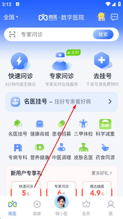 1、打开微医APP,在首页点击名医挂号-挂好专家看好病选项。