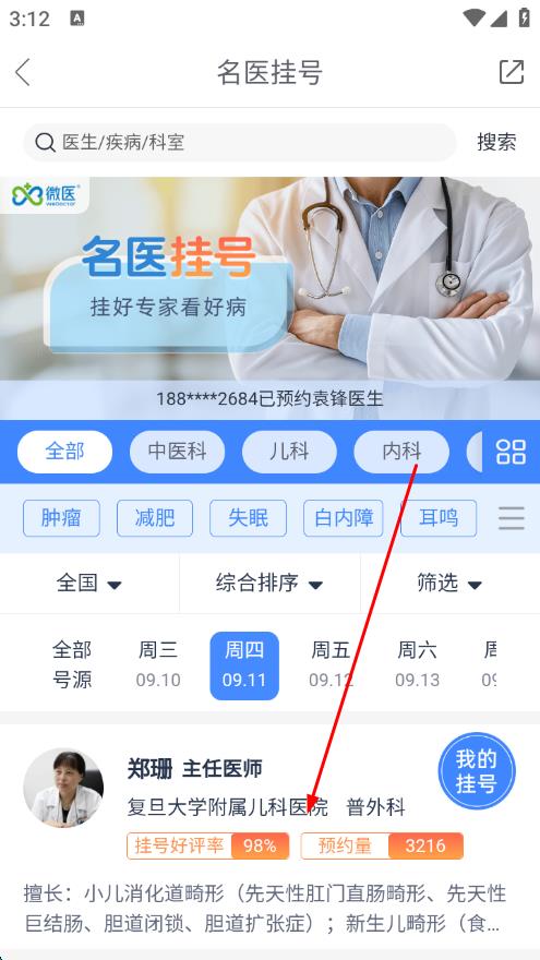 3、选择想要挂号的专家医生,点击进入该专家的详情页面。