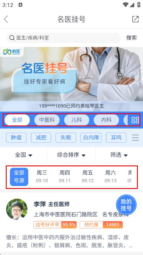 2、进入名医挂号页面后,通过页面中的科室分类标签,筛选专家所在科室,还能通过选择日期筛选号源。