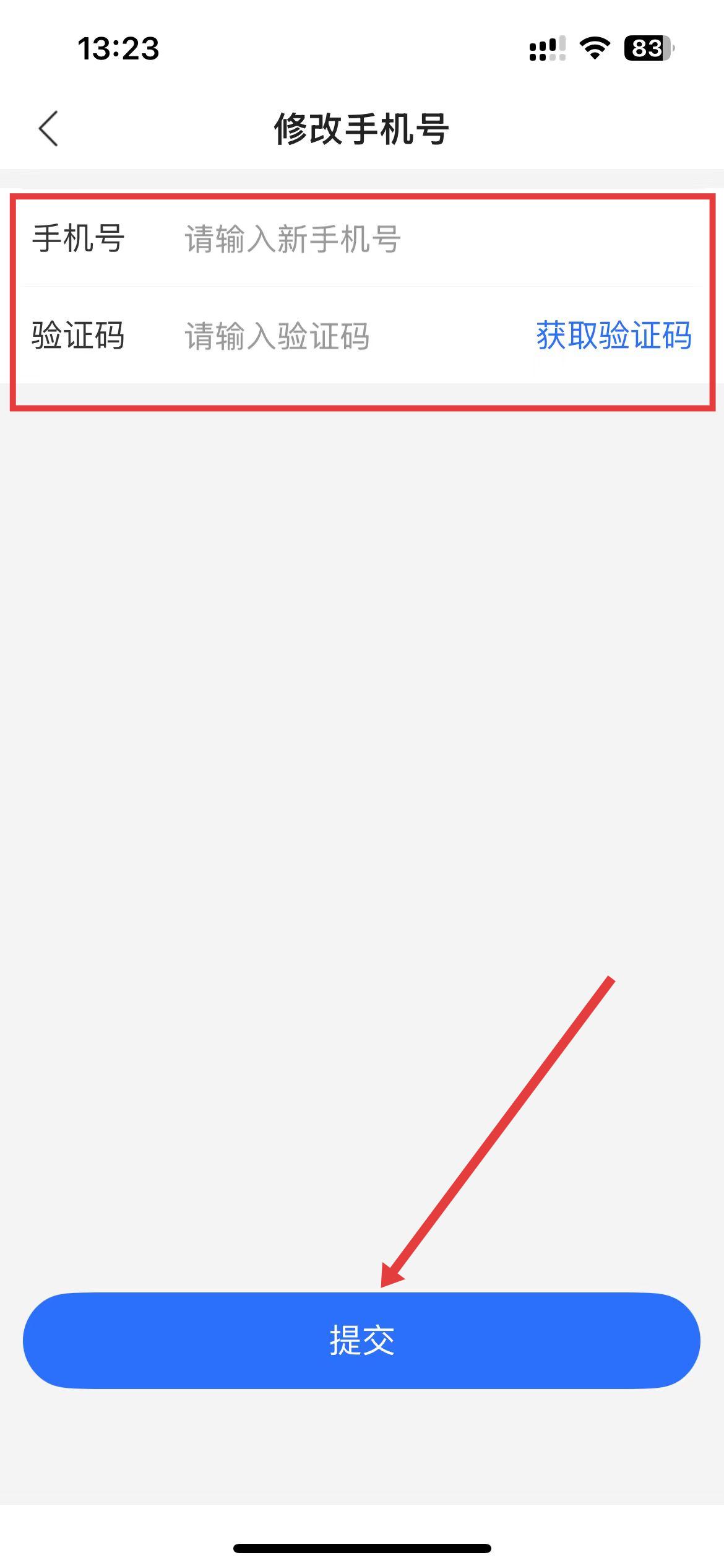 5、在修改手机号页面,输入新手机号,获取输入验证码,最后点击提交,即可完成手机号修改。