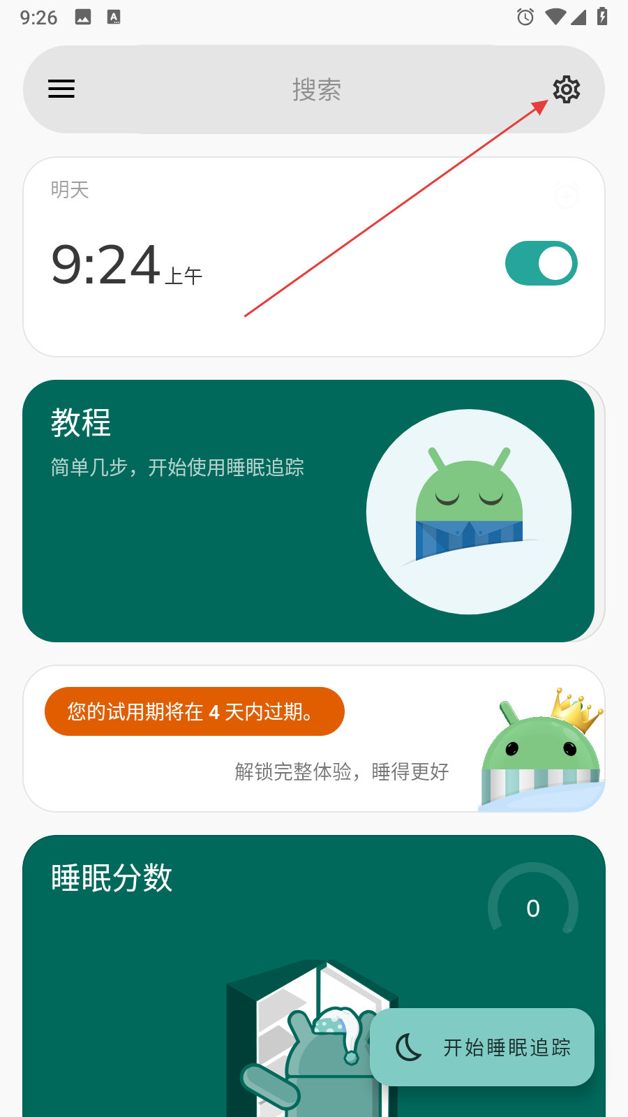 1、打开睡眠追踪APP,在首页点击右上角的设置图标,进入设置页面。
