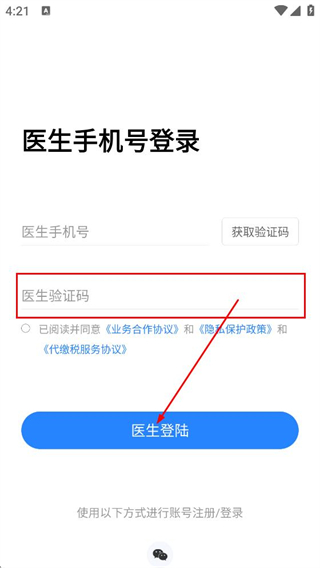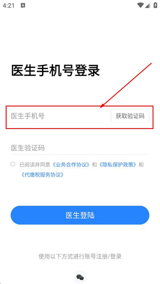 2、在医生手机号登录页面,填写医生手机号,点击获取短信验证码。
