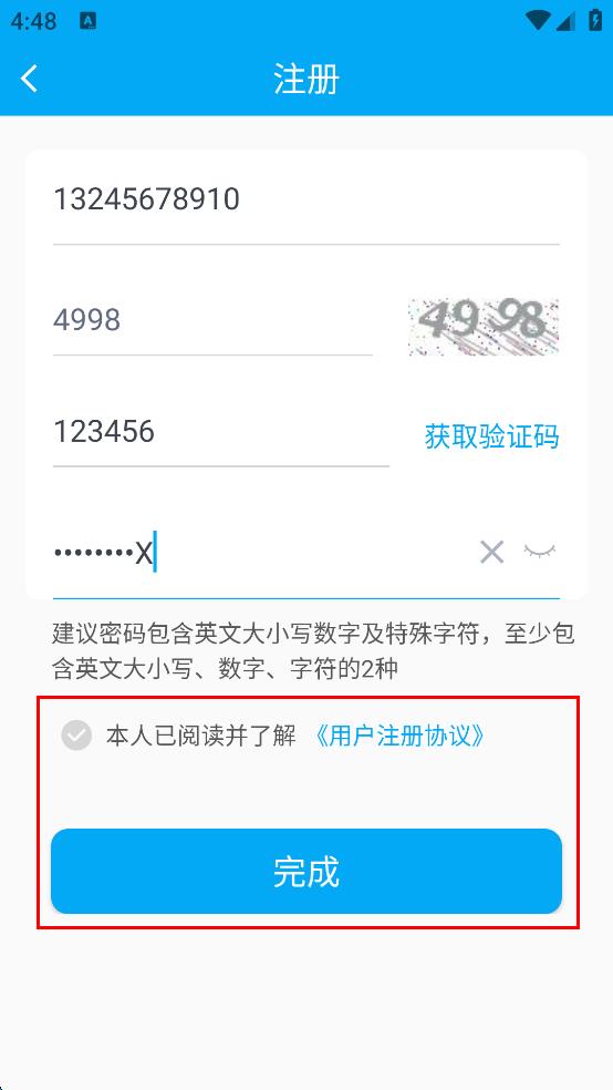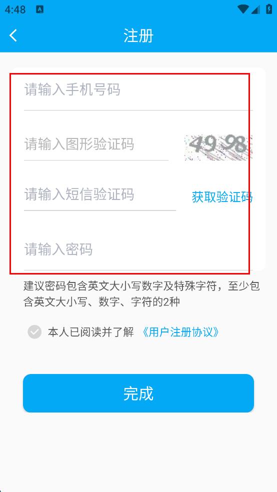 4、勾选本人已阅读并了解用户注册协议,最后点击“完成”按钮,即可完成注册。