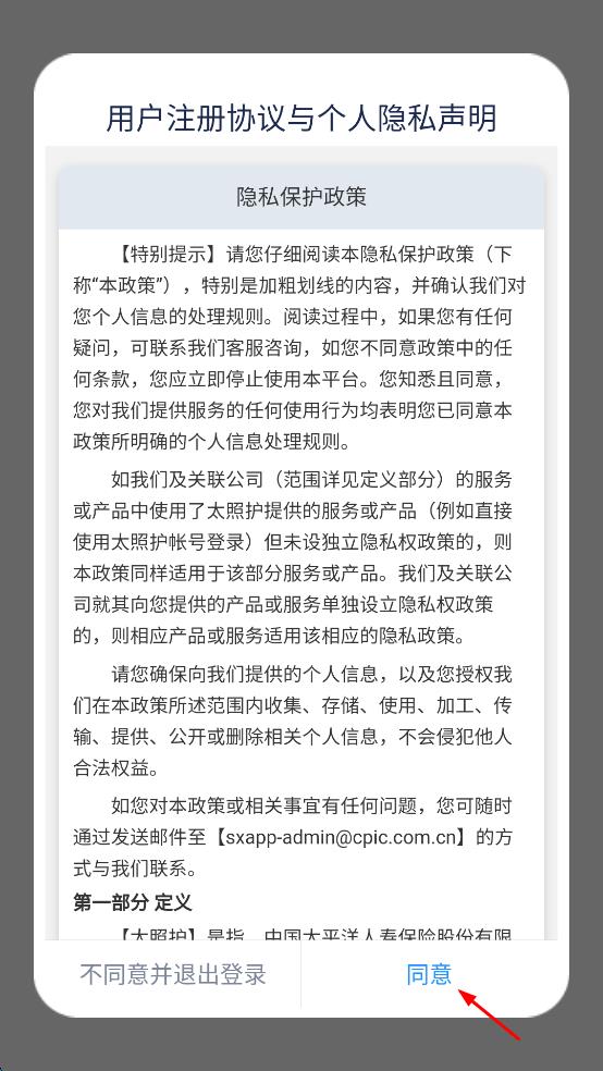 1、打开太照护APP,会看到“用户注册协议与个人隐私声明”提示框,仔细阅读内容后,若同意相关条款,点击“同意”,进入登录页面。