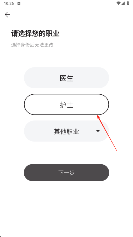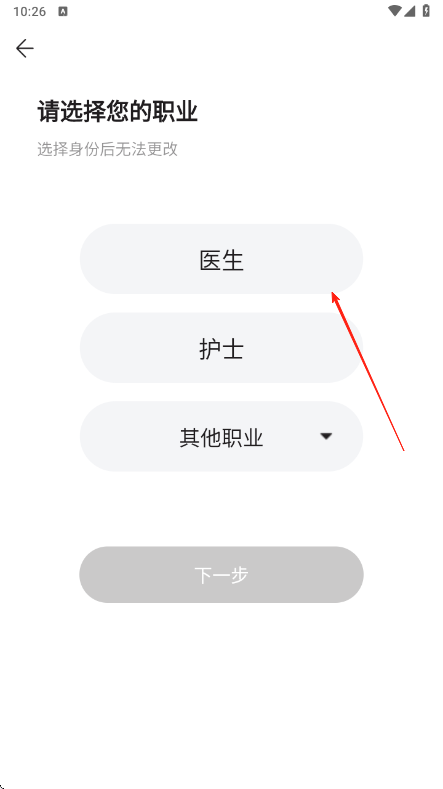 1、打开医疗APP进入职业认证页面,浏览职业选择列表,从中挑选医生护士或其他职业,确认所选职业后点击确定按钮,注意选定后该选项将无法更改。