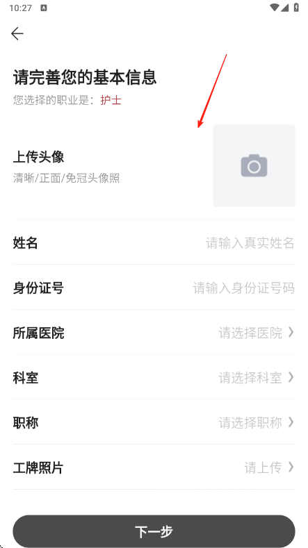 2、若选择护士职业,跳转至信息完善页面,点击上传头像区域,按要求选取清晰正面免冠照片完成上传,接着依次填写姓名身份证号等基本身份信息。