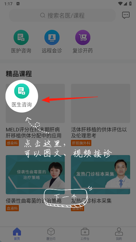 1、打开医疗APP进入首页,在精品课程区域找到医生咨询图标,点击该图标,可进入图文、视频接诊界面,开展医患沟通相关服务。