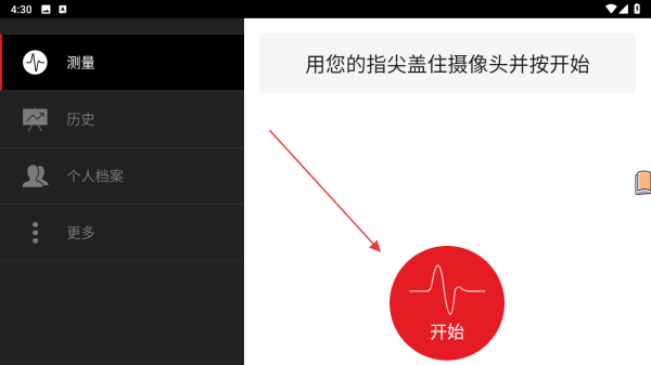 1、打开心率仪应用,进入测量界面,依据提示,用指尖盖住手机摄像头,之后点击界面中红色的开始按钮,开始进行心率测量。
