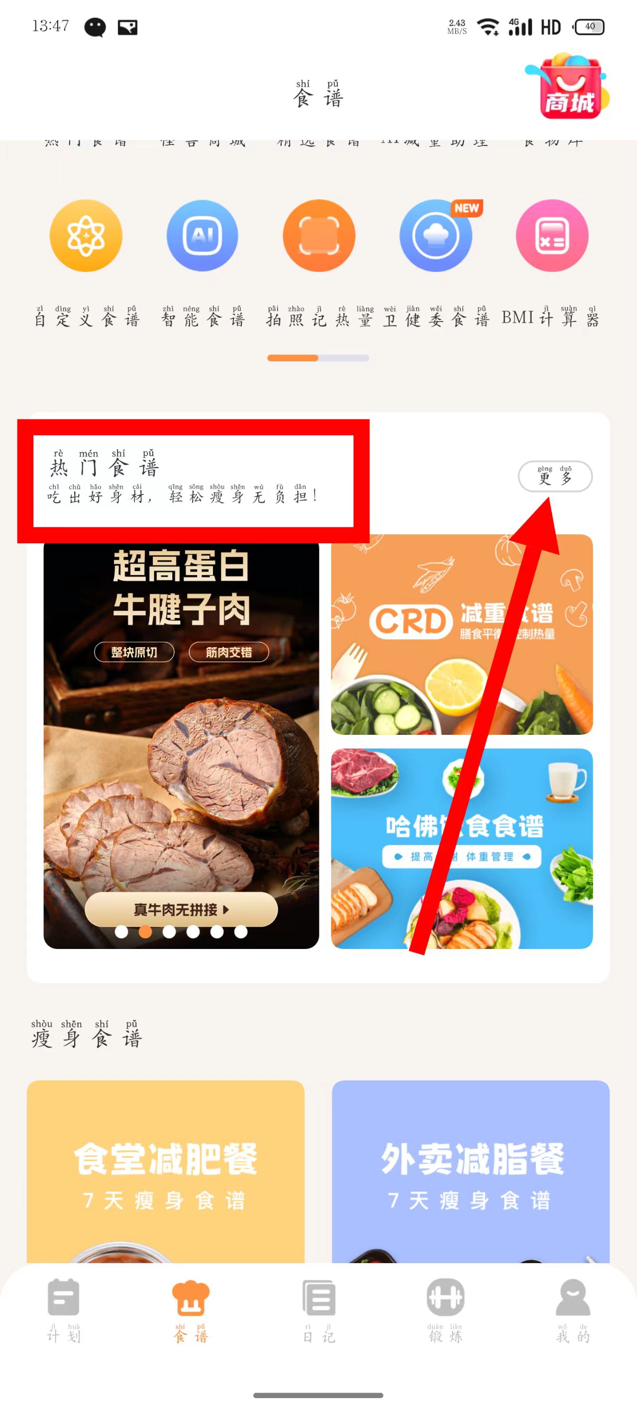 2、在食谱页面,找到热门食谱板块,点击更多。