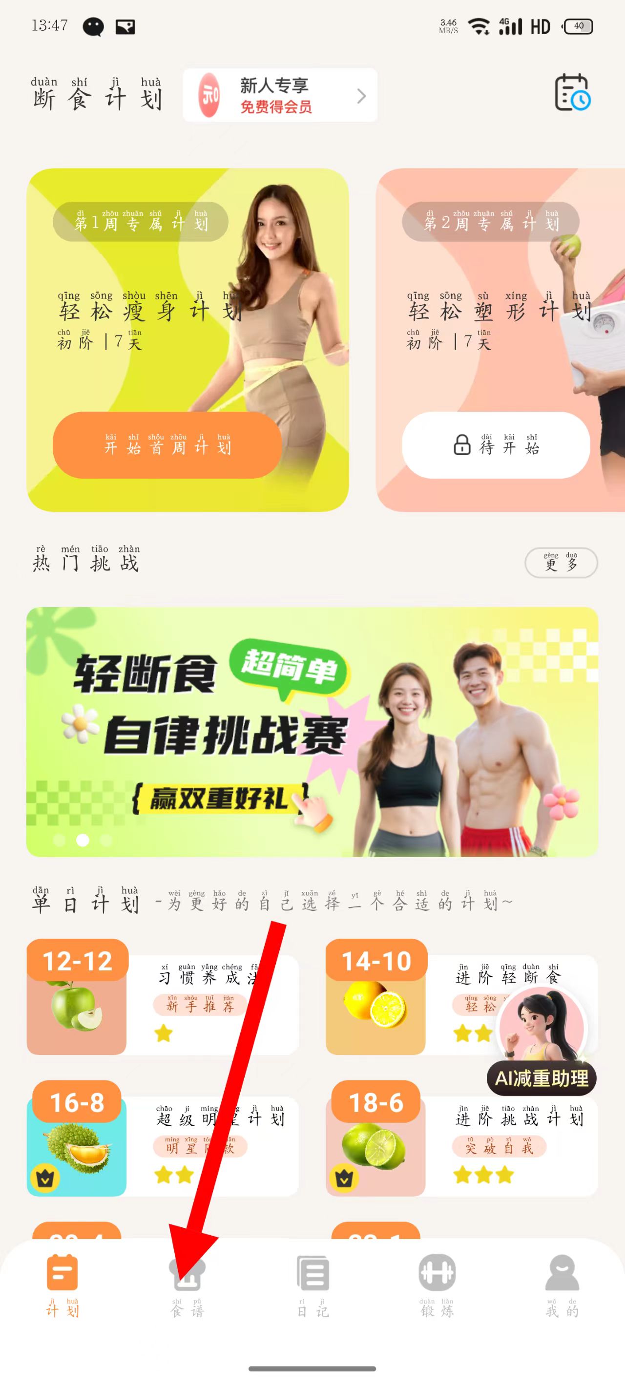 1、打开怪兽轻断食软件,点击底部食谱选项。