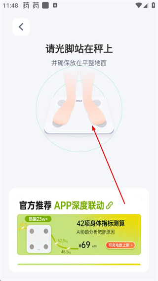 3、按照提示光脚站在体脂秤上,完成设备与App的连接配对。