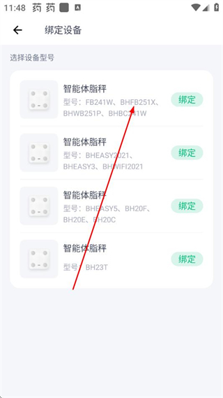 2、在绑定设备页面选择对应的智能体脂秤型号,点击右侧绑定。