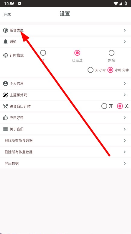 2、在设置页面,点击断食类型选项。