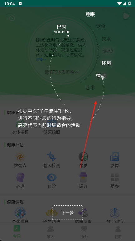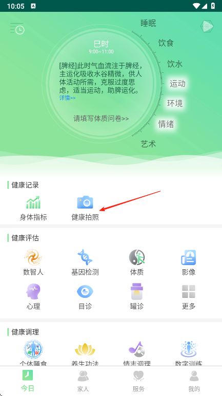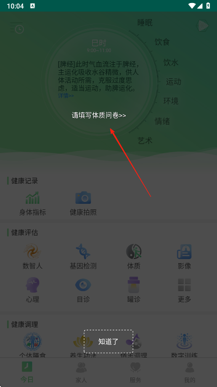 1、打开健康管理APP进入今日页面,了解此时气血流注脾经及运化吸收水谷精微等内容,按箭头指引点击填写体质问卷,开始完善个人健康基础信息。