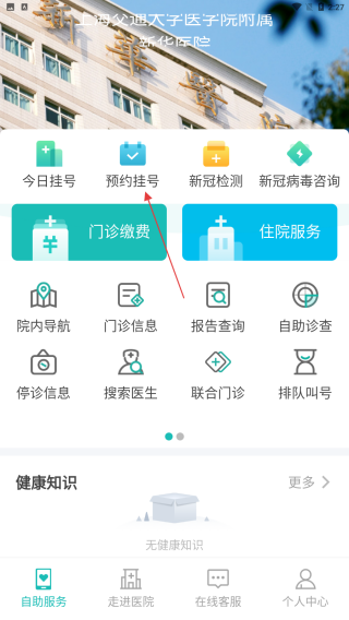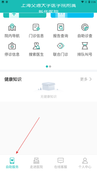 1、打开上海新华医院APP,点击底部导航栏的自助服务选项,进入自助服务页面,在此页面可看到多种与就医相关的便捷服务功能。