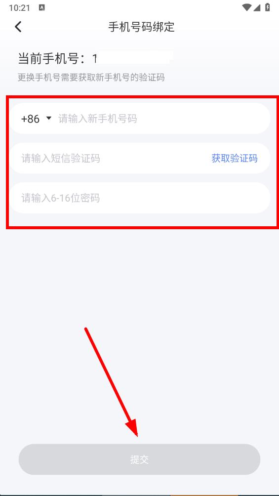5、在页面输入新手机号,获取并输入短信验证码,再设置密码后,点击提交,即可完成手机号修改。