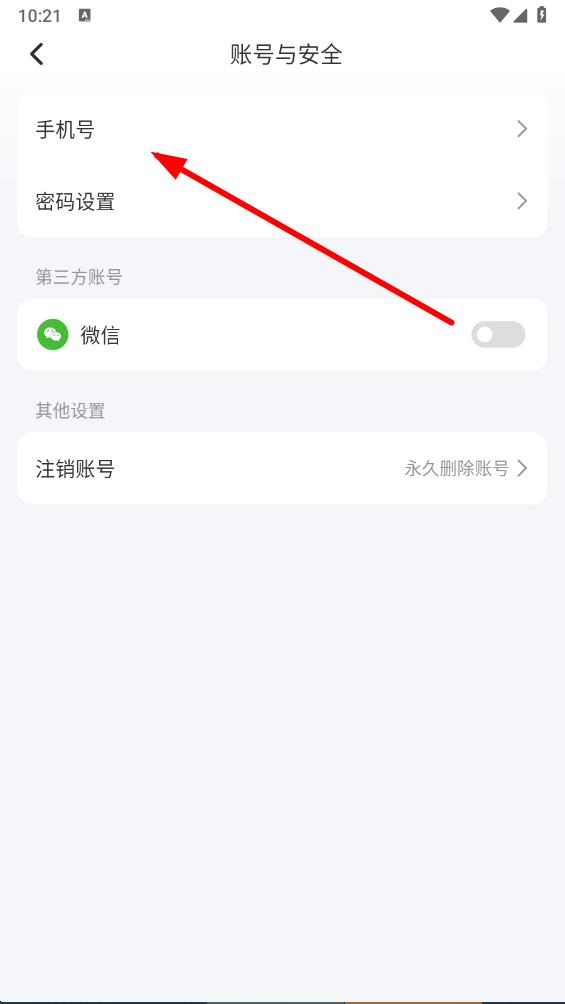 4、在账号与安全界面中,点击手机号选项,进入手机号绑定界面。