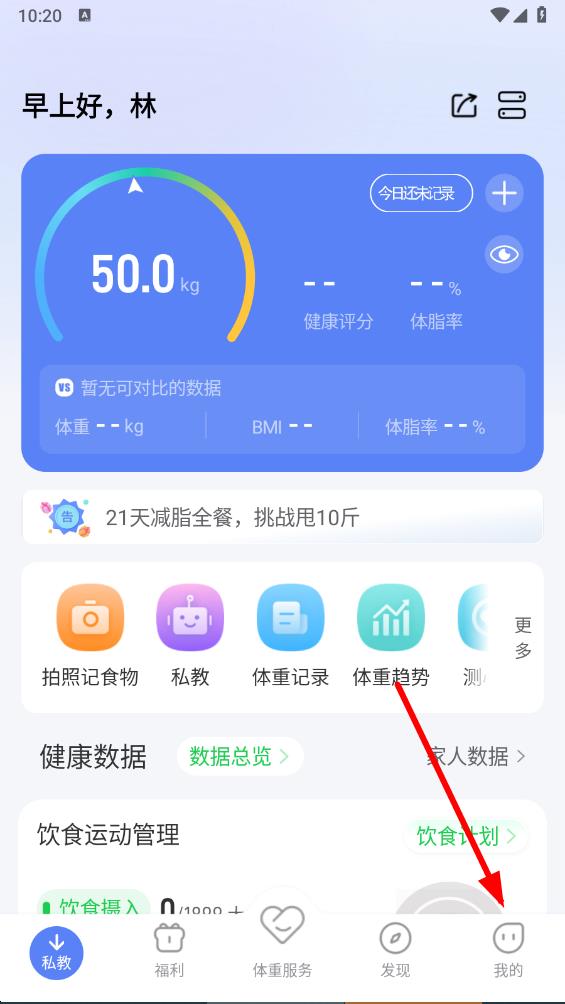 1、打开轻牛健康app,在首页点击底部导航栏最右侧的我的图标,进入个人相关界面。