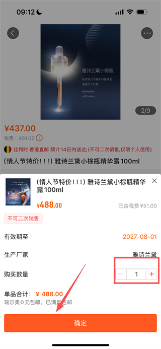 4、在选择窗口,确认数量后点击确定,即可将商品加入购物车。