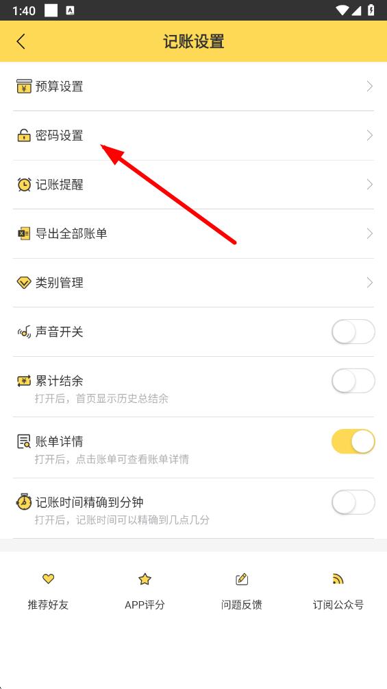 3、在记账设置页面里,点击密码设置选项,进入密码设置界面。