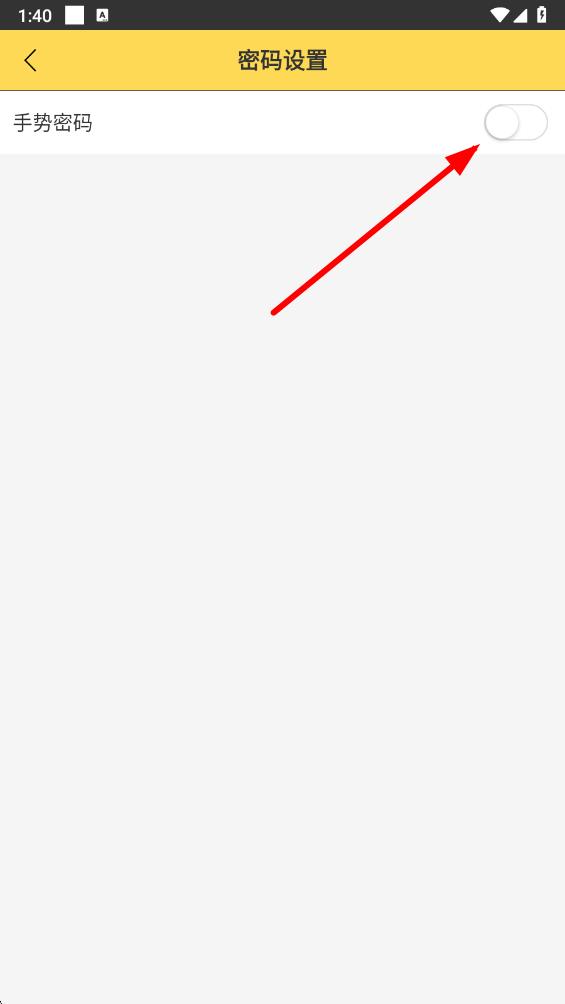 4、在密码设置界面,点击手势密码右侧的开关,按照提示绘制并确认手势密码,即可完成密码设置。