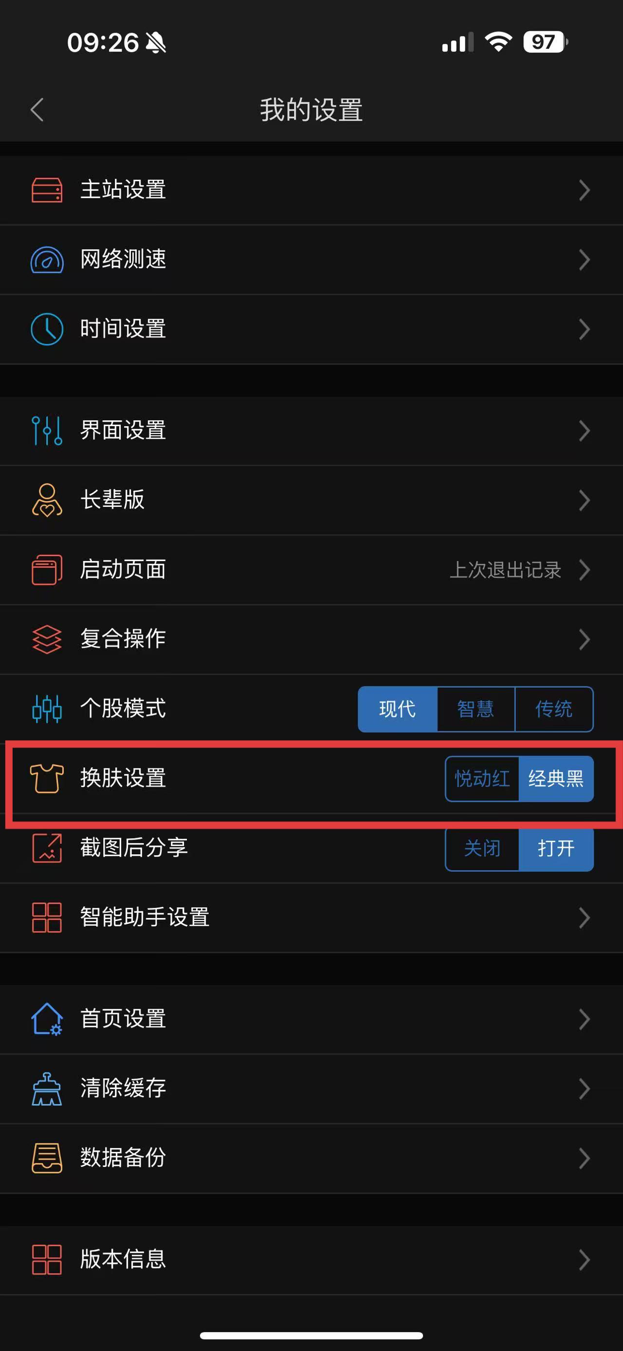 4、在我的设置页面中,找到换肤设置选项,点击选择自己喜欢的皮肤,如悦动红或经典黑。