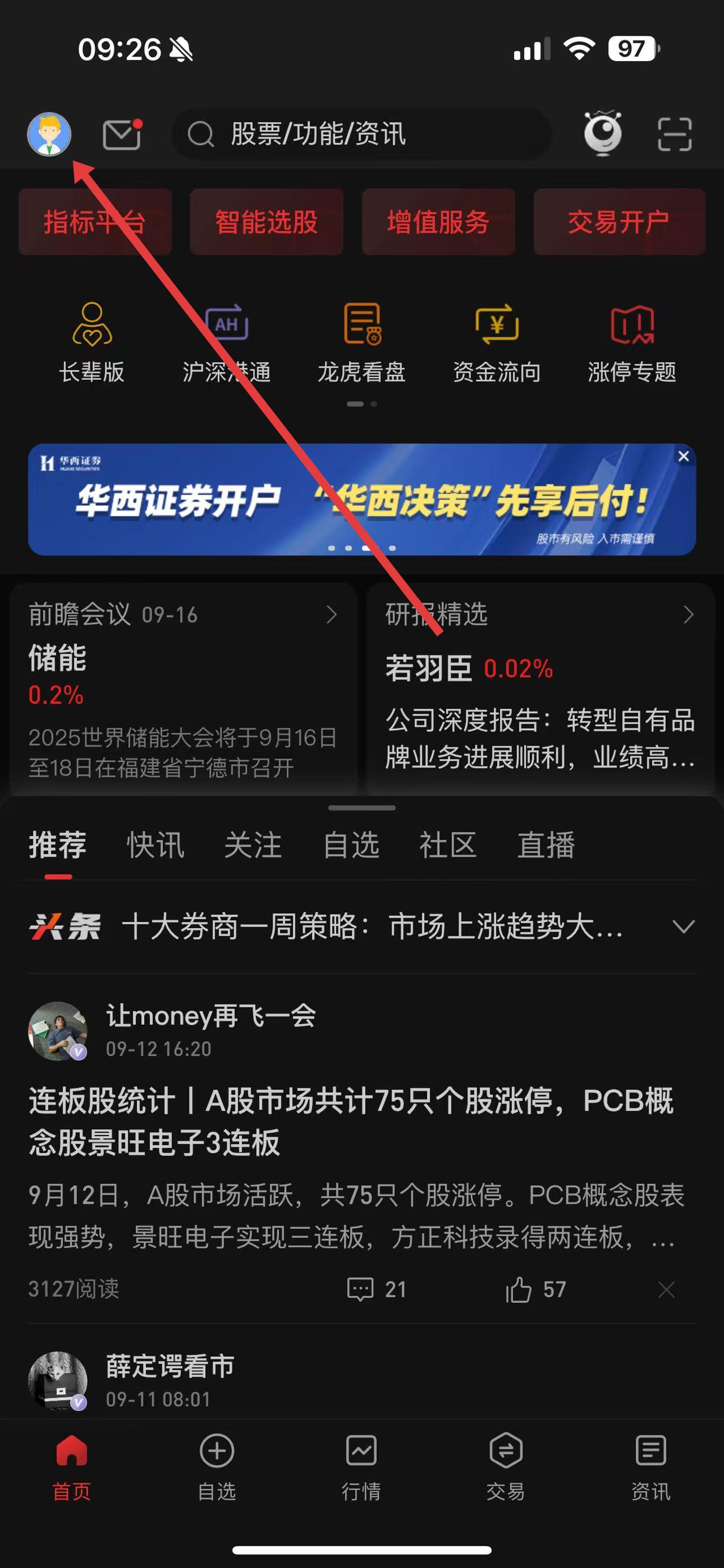 2、在首页界面中,点击左上角的头像图标,进入个人相关页面。