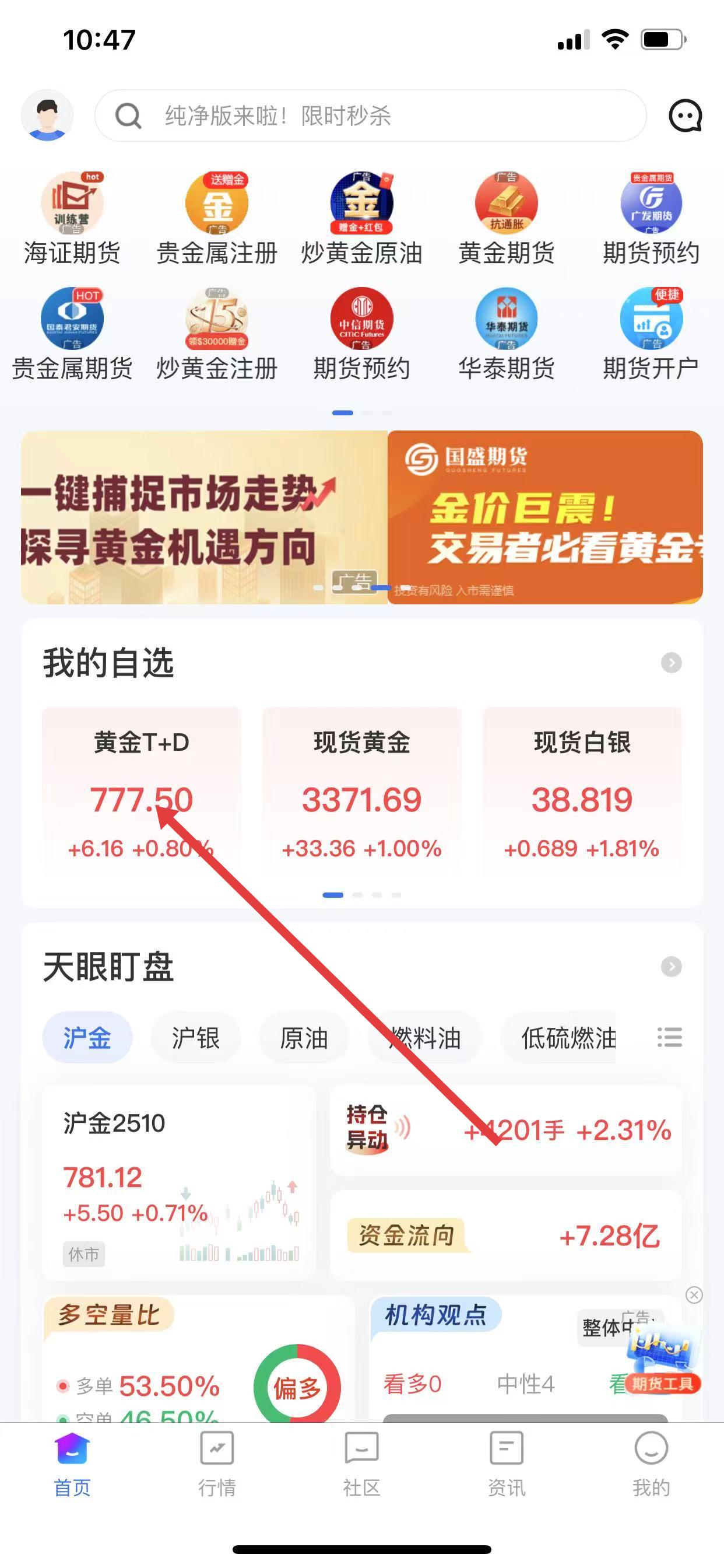 1、快速浏览行情:每日打开应用,通过首页“我的自选”和“天眼盯盘”板块,快速浏览黄金等投资品种的实时价格和涨跌情况,把握市场初步动态。