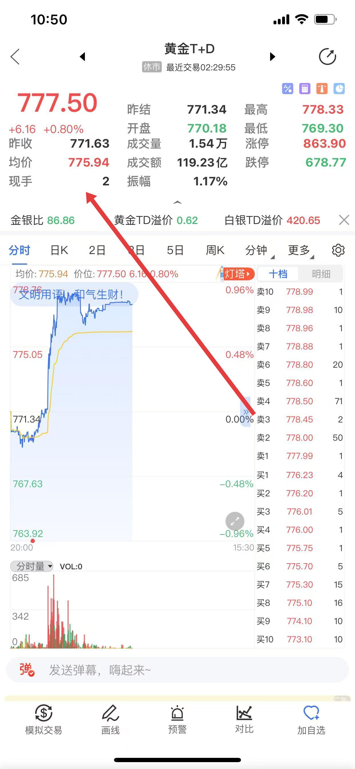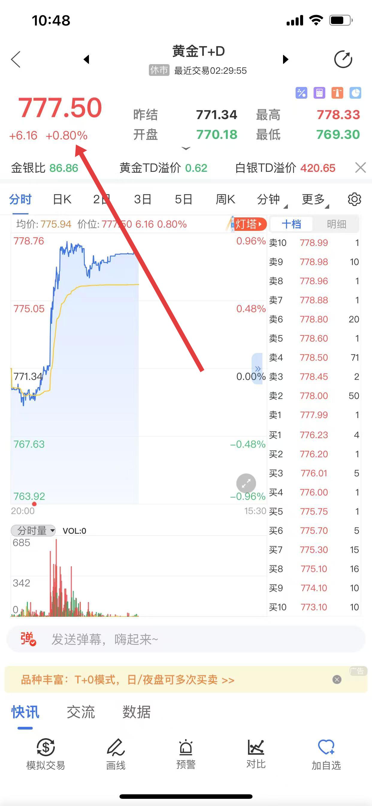 2、进入详细行情页面,能看到今日黄金T+D的今日金价。