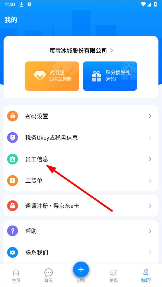 2、在我的页面里,找到并点击员工信息选项,进入员工信息管理界面。
