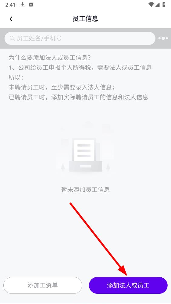 3、在员工信息界面中,点击添加法人或员工按钮,准备录入新的员工信息。