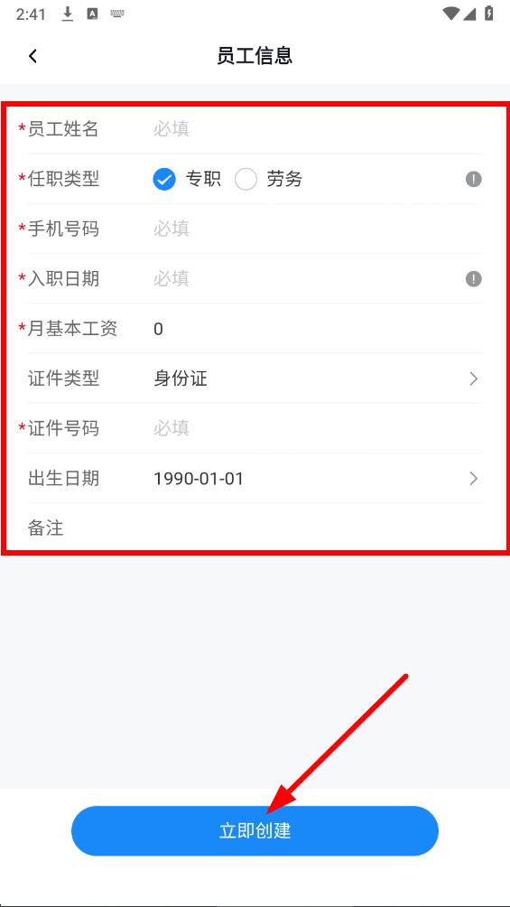 4、在弹出的信息录入页面,依次填写员工的信息,确认无误后点击立即创建按钮,完成员工信息的添加。
