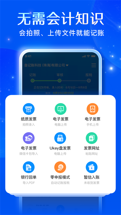 1、纸质发票拍照录入,无需会计知识,会拍照就会记账,支持电子发票直接导入;