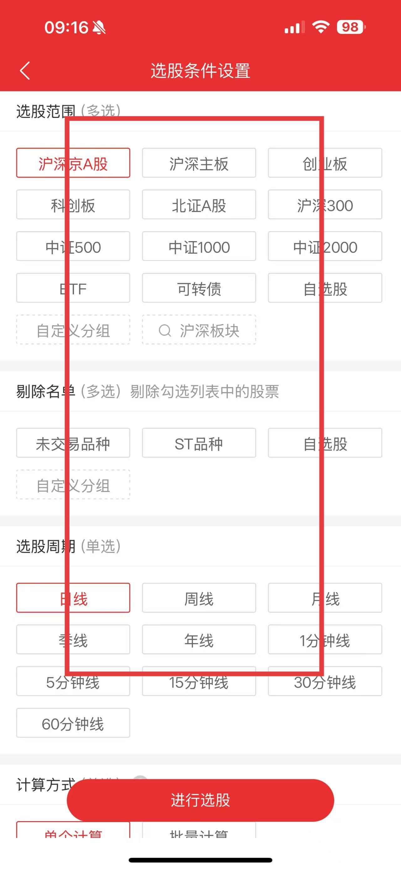 3、进入选股条件设置页面,设置选股范围、剔除名单、选股周期等条件后,点击进行选股。