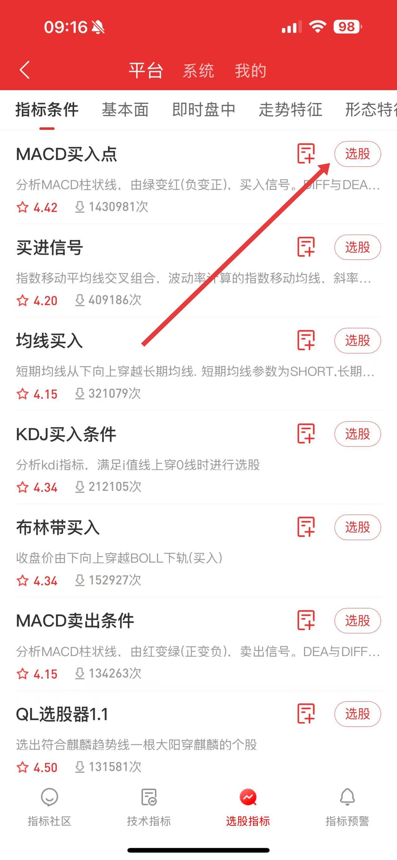 2、在选股指标页面,浏览指标列表,选择如MACD买入点等心仪的选股指标,点击其右侧的选股按钮。