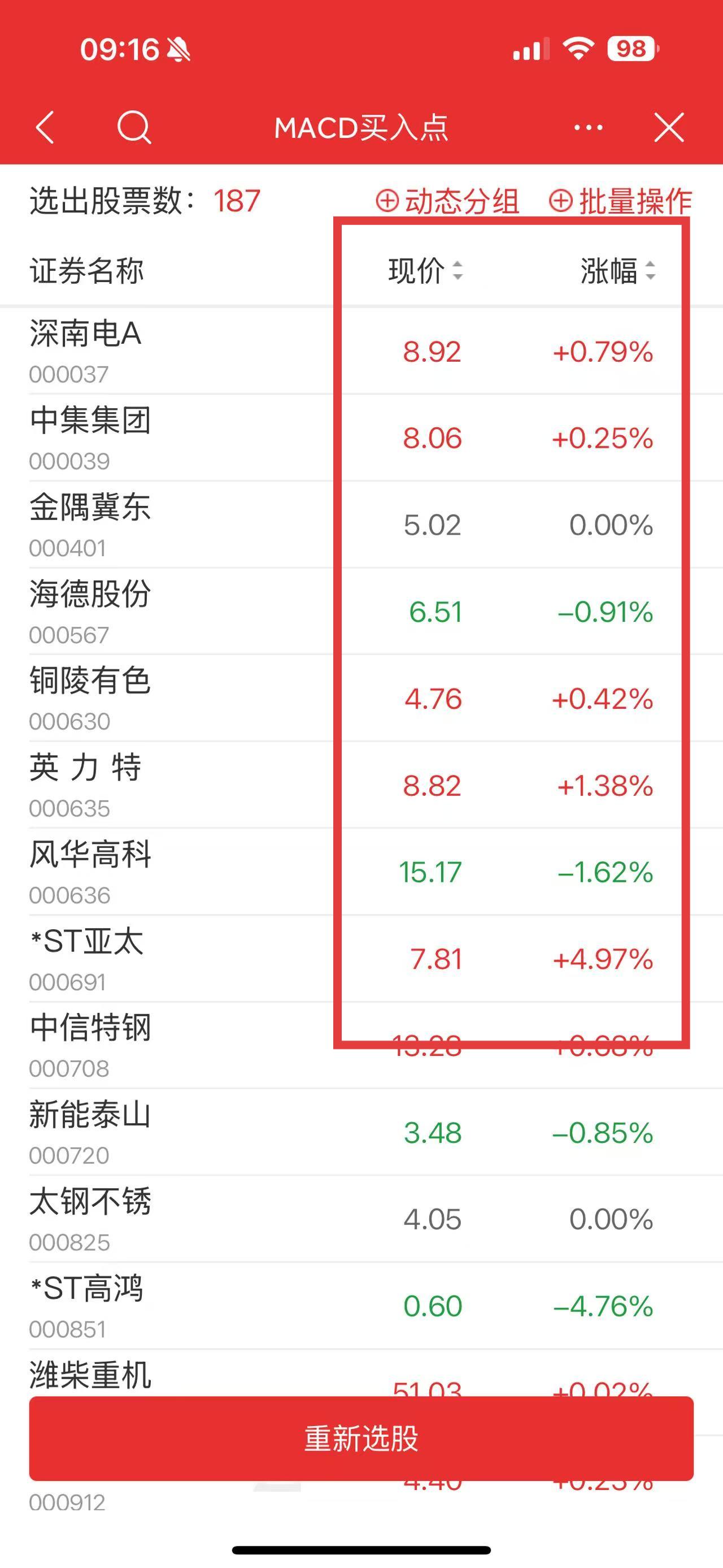 4、选股完成后,查看选出的股票列表,参考现价、涨幅等数据筛选股票。