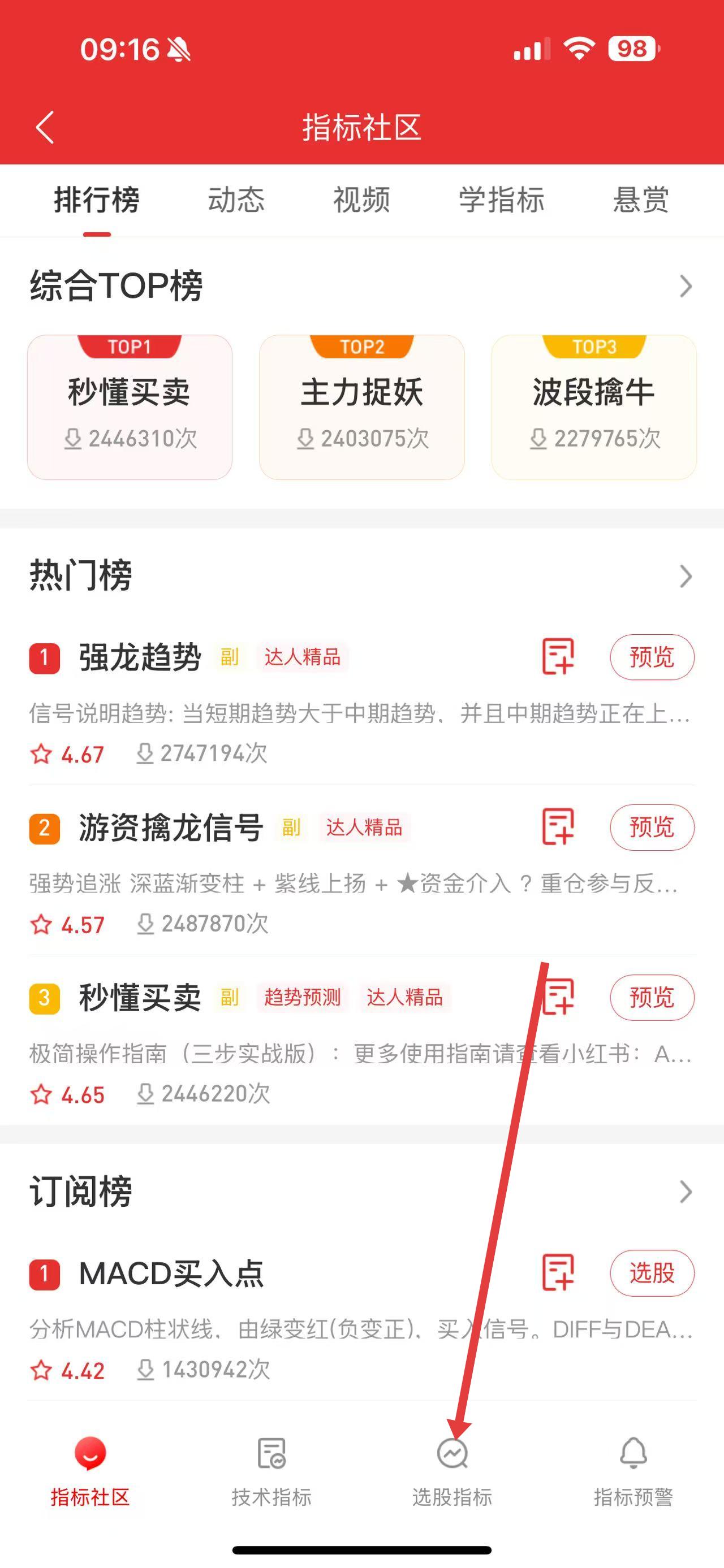1、打开通达信应用,进入指标社区页面,点击底部的选股指标。