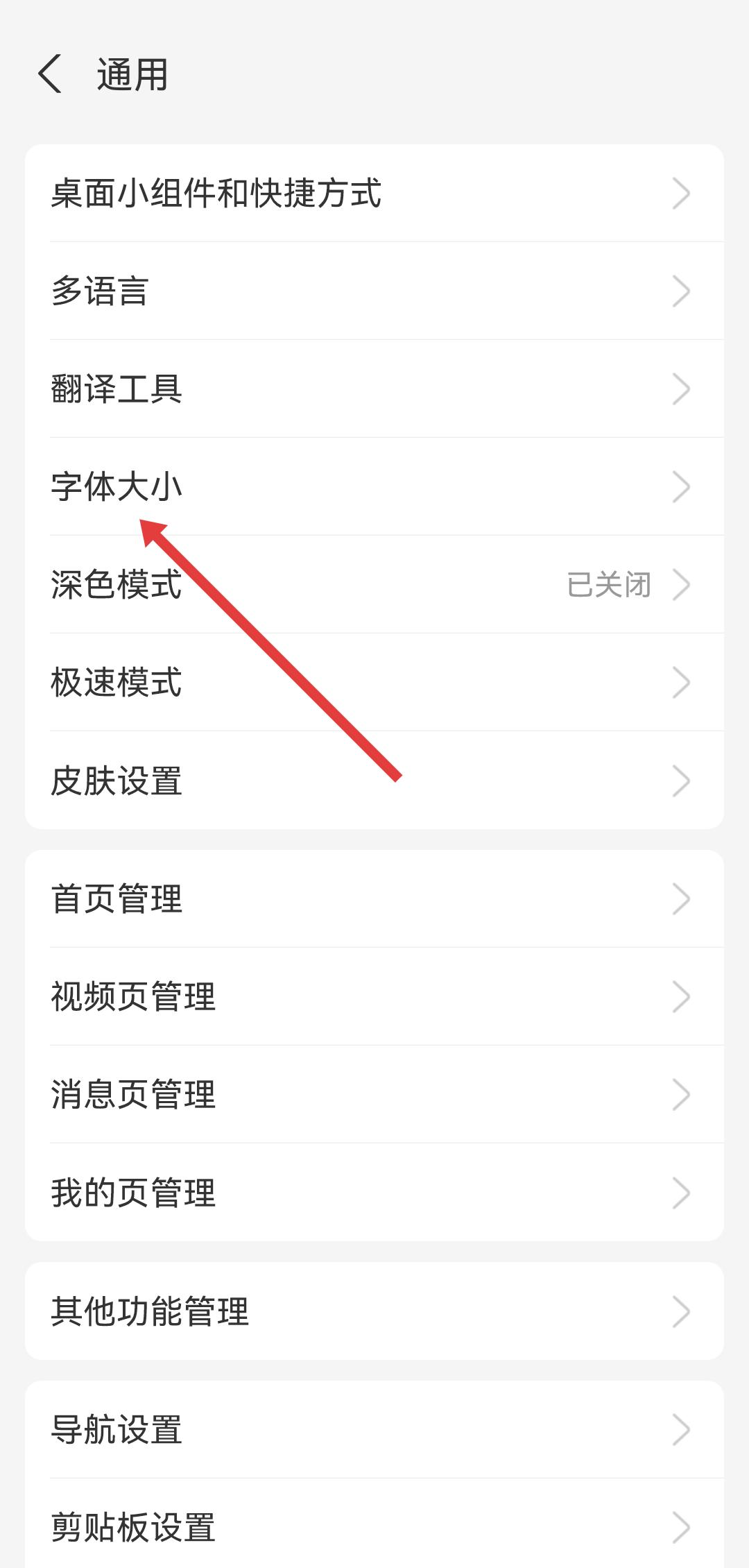 3、在通用设置界面,点击字体大小的选项,进入字体大小调整页面。