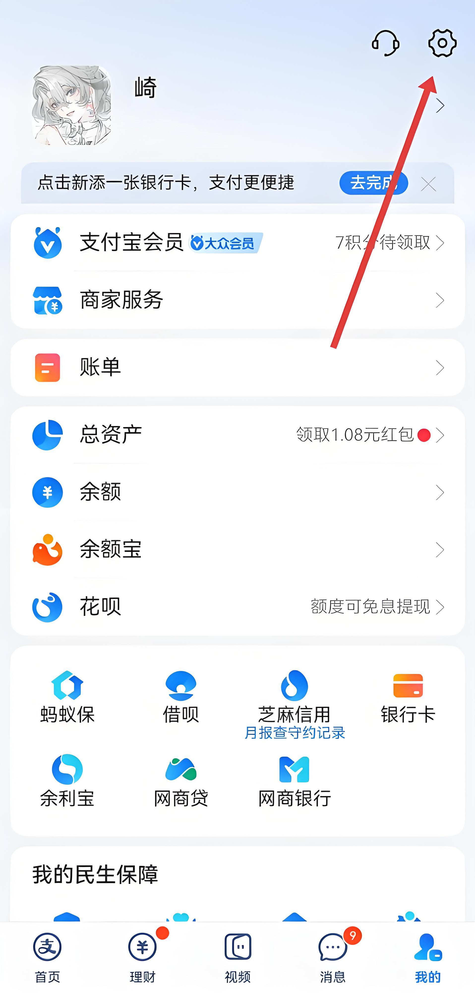 1、在支付宝我的页面,点击右上角的设置图标,进入设置界面。