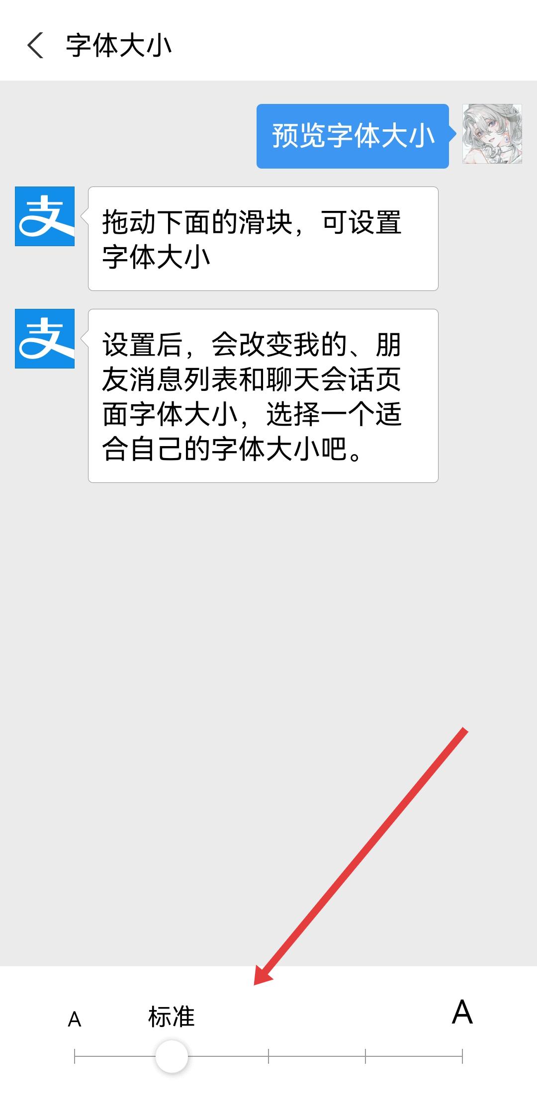 4、在字体大小调整页面,拖动底部的滑块,即可设置支付宝的字体大小。