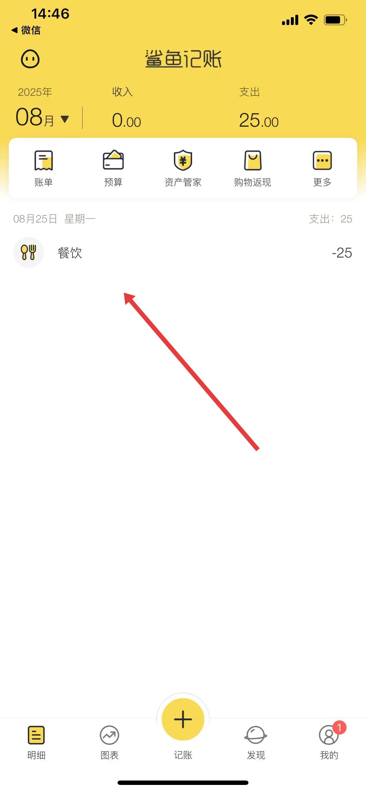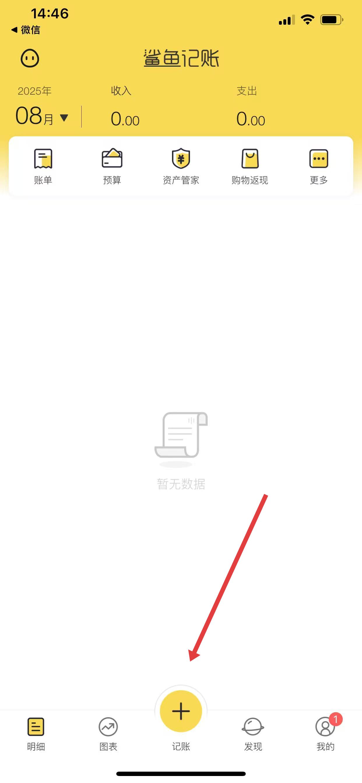 1、打开鲨鱼记账APP,点击底部中间+记账按钮,进入记账页面。