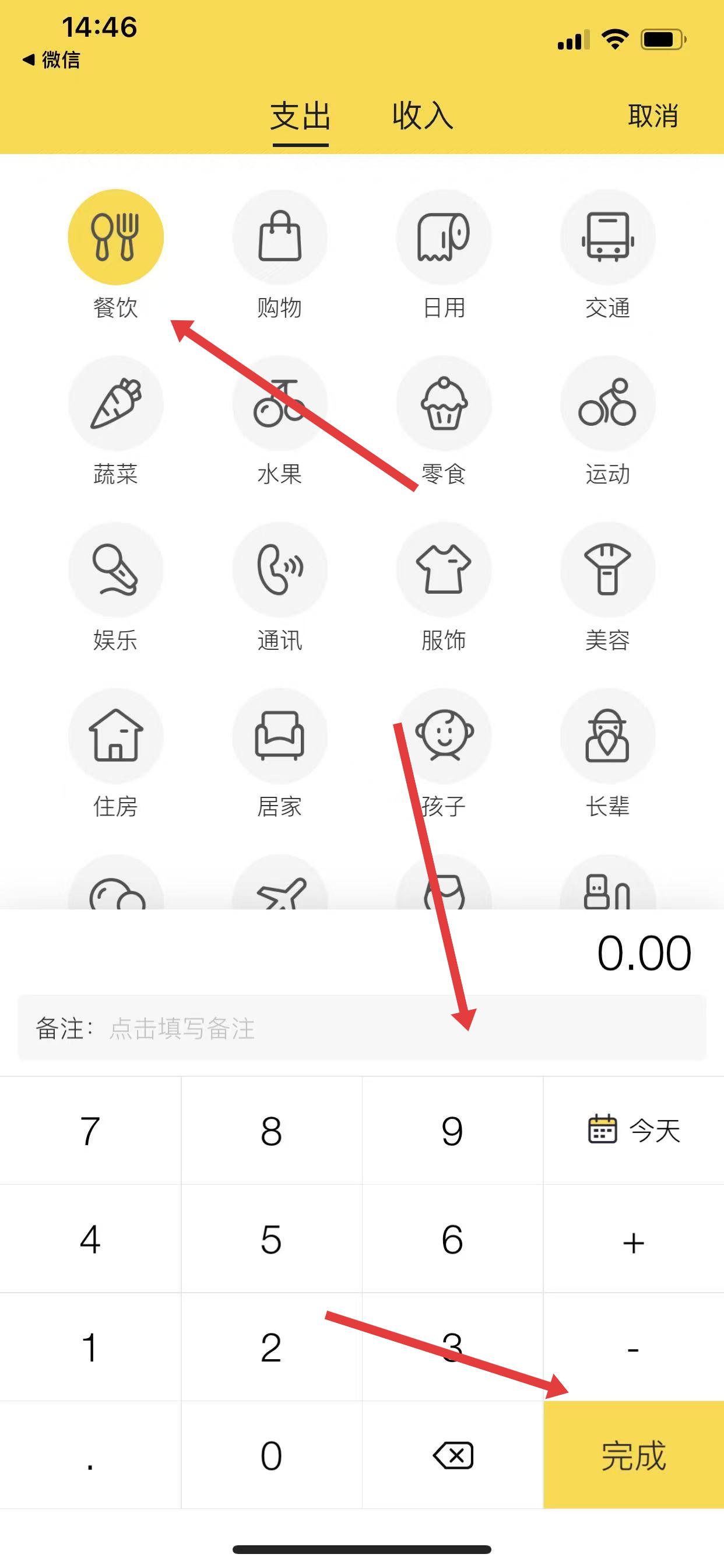 2、在支出或收入标签下,选对应类目,输入金额,点击完成。