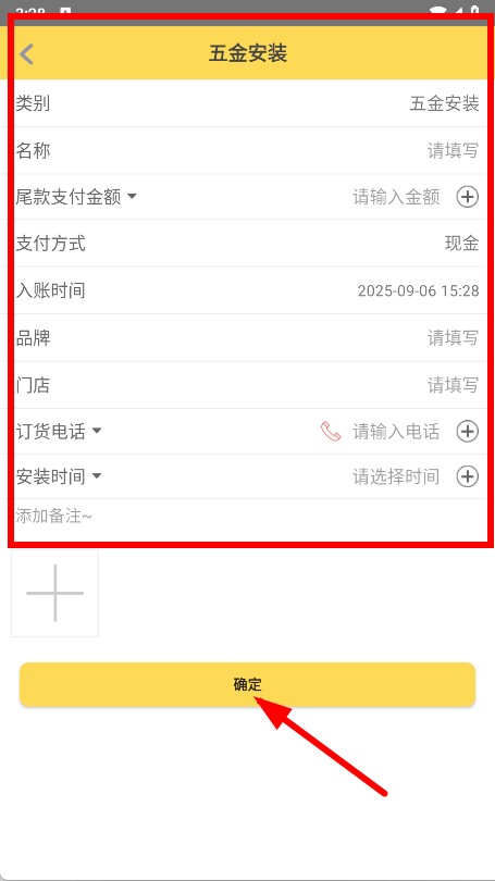 4、填写名称、金额、门店等信息,添加备注后,点击确定,即可记录五金安装账单。